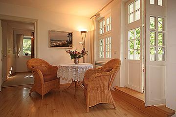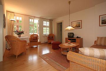 Die Wohnung I hat eine Südwestlage. Sie ist 45 qm groß und bietet Platz für 2 – 3 Personen. Ein abgeschlossener Schlafraum, ein großzügiger Wohnraum sowie eine kleine Küche und ein Duschbad mit WC gehören zur Wohnung. Der Wohnbereich ist mit einem Laminatboden ausgestattet, das Bad ist gefließt. Von einem großen, überdachten Balkon blickt man auf das parkähnliche Grundstück und die bewaldeten Stranddünen.